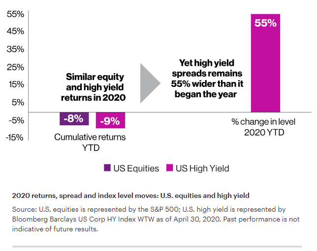 The tremendous government support helped markets recoup much of the negative returns of March; however, while returns have been comparable, credit spreads remain relatively wide — 55% higher than the start of the year — indicating that markets are pricing in a much more negative scenario for credit versus equities. While government programs have helped support credit markets, we feel significant opportunities to capture value remain.