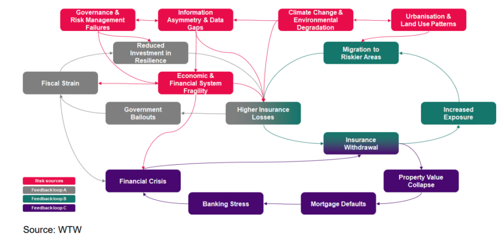 An important result of adopting a risk 2.0 mindset is a better understanding of the key drivers of a given risk event, the broader impacts of these and the associated feedback loops and interaction effects. This is set out at a high level below for the uninsurable futures scenario described in part 6: