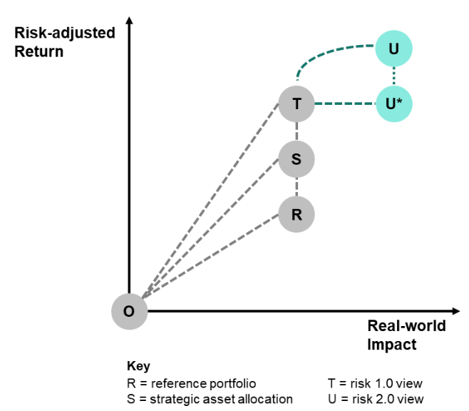 A third benefit is that a risk 2.0 mindset starts by considering the System and systemic risk which means true risk management must include system stewardship. An investor with this mindset recognises that a current investment in the future public good can result in subsequent private gain and/or that reducing the likelihood or severity of systemic risks increases the value of all financial assets. This takes us from position T to U* or U in the figure below.
