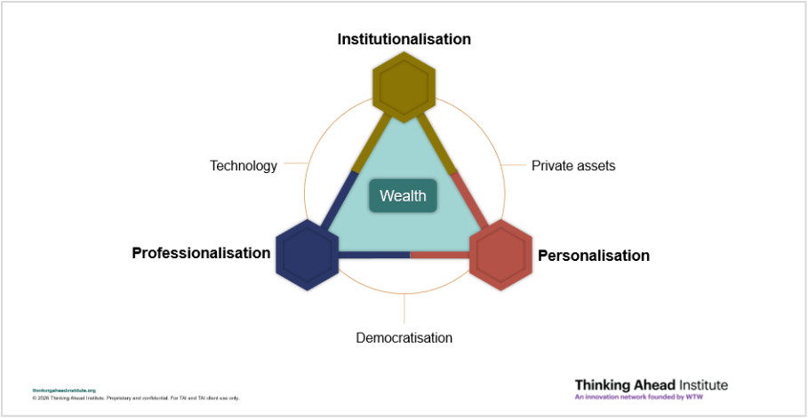 As illustrated in the graphic below, wealth sits at the centre of a set of attractive and repulsive forces that continuously shape it. At a high level, this system can be articulated around a triangulation of three long-running forces: