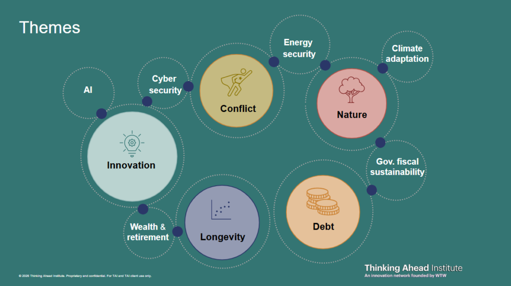 The thematics workstream, in collaboration with WTW, will examine enduring structural forces that shape economies and markets over long horizons. These themes provide a unified framework for identifying where risks and opportunities are positioned and how markets are pricing them.