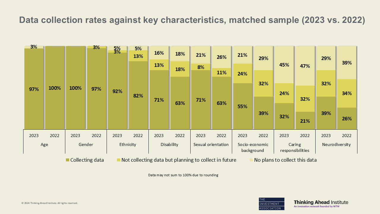 - Age (97%), gender (100%), and ethnicity (92%) have the highest response rates, and an increasing number of firms are now also collecting data on disability (71%), sexual orientation (71%), and socio-economic background (55%)